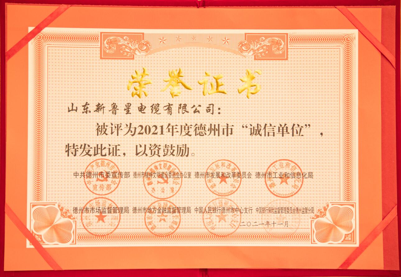 為推動德州市文明城市創建和社會信用體系建設,由德州市發展和改革委員會組織,由德州市委宣傳部、市文明辦、市發改委、市工信局、市市場監管局、市金融監管局、人行德州中心支行、德州銀保監分局八部門聯合評選的德州市“誠信單位”表彰大會于12月15日上午在德州召開,山東新魯星電纜有限公司董事長王紅梅女士作為受表彰的優秀民營企業代表上臺領獎。